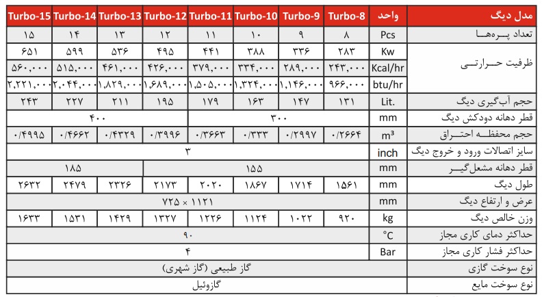 | مدل دیگ | طول دیگ (میلیمتر) | عرض دیگ (میلیمتر) | ارتفاع دیگ (میلیمتر) | قطر دهانه دودکش (میلیمتر) | قطر دهانه مشعل (میلیمتر) | وزن خالص (کیلوگرم) |